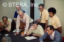 One of the STURP team's many meetings in the hotel in Turin before beginning their examination of the Shroud in 1978. Pictured l to r are Ernest Brooks, Ray Rogers, Don Janney, Eric Jumper, Rudy Dichtl, John Jackson & Ken Stevenson.