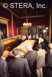 Researchers take their first look at the Shroud at the beginning of the 1978 scientific examination. Using magnets, the cloth would soon be fastened to the examination table seen far left.