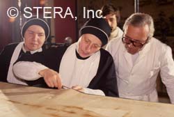 Poor Clare Nuns separate a four inch section of the Shroud of Turin from its backing cloth as Professor Giovanni Riggi and his assistant, Gabriele Porratti look on.